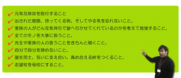 例えば、「最初は解らない箇所も解らず、質問することも恥ずかしくてできない。けれど、最後には自らが進んで質問することができる人になってほしい。」そのような思いで塾生に接しています。 |