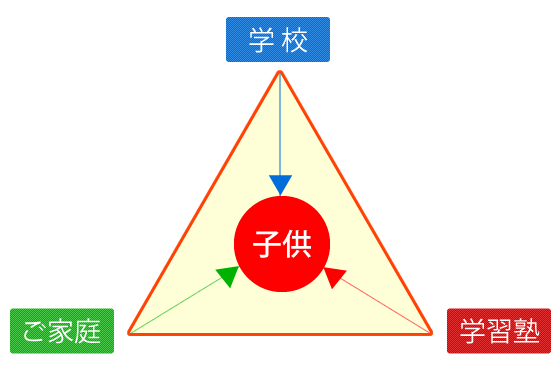 私たちの考える学習塾の役割とは、学校と家庭と塾とを三角形で結んだ